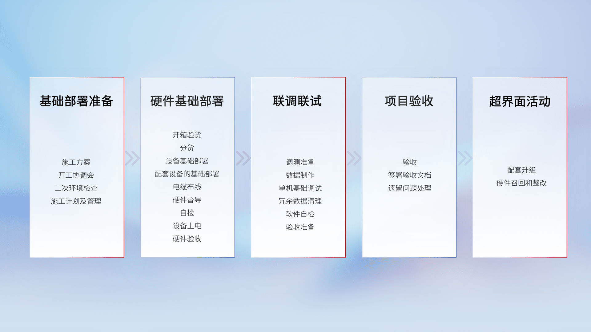 从基础部署准备、、、硬件基础部署、、、、联调联试、、项目验收、、、、越界面活动的全过程可追溯,,保证施工质量和进度。。